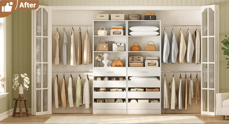 Aheaplus Closet System, 6-15 ft. Closet Organizer with 8 Wooden Drawers, Wood Closet Organizer system with Tower, Walk-in Closet Organizer Wardrobe Clothes Rack with 4 Hanging Rods, Garment Rack, Color: White