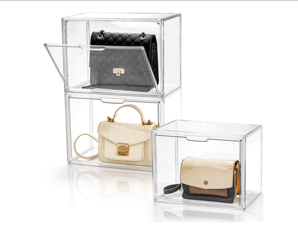 AVLA 3 Pack Plastic Handbag Storage Organizer for Closet, Clear Acrylic Display Case with Magnetic Door, Luxury Stackable Purse Clutch Organization Color: Clear