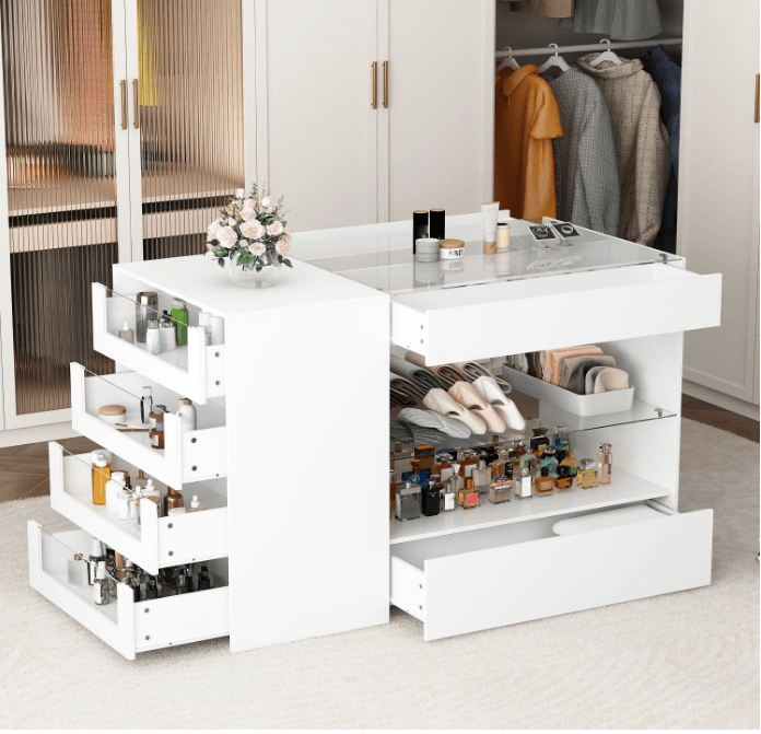 Homsee Wardrobe Armoire Bedroom Island with Glass Top, Glass Display Shelf & 6 Drawers, Wooden Closet Storage Cabinet with Open Shelves for Closet Color: White