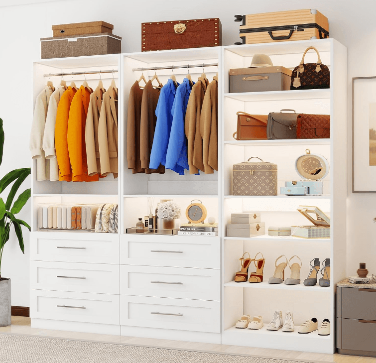 Closet System with 3 Sets, 6 ft. Closet Organizer Systems with 6 Wooden Drawers, 8 Shelves & 4 Hanging Rods, Walk in Closet Freestanding Corner Modular Closet Storage System, White