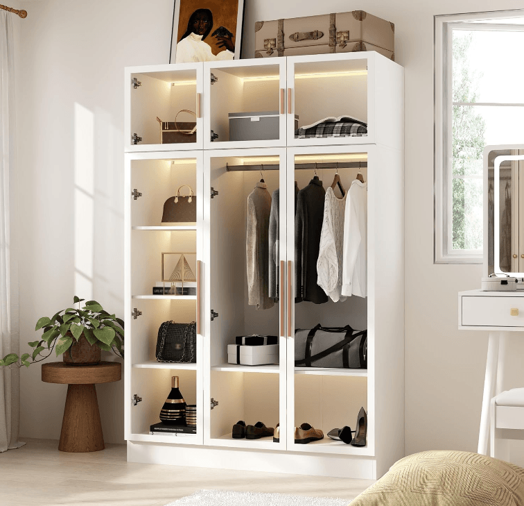 Hitow Wardrobe Cabinet with LED Lights, Armoire Closet with Glass Doors, Wooden Large Wardrobe with Hanging Rod & 5 Tier Shelf, Modern Bedroom Armoire Color: White