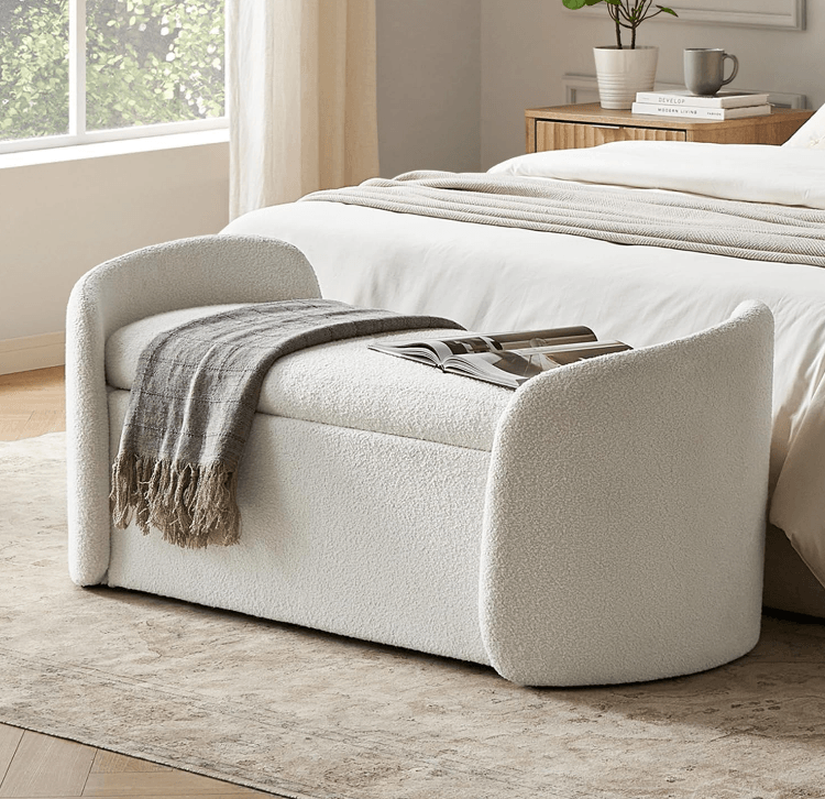 Mopio Sophie 51" Ottoman Storage Bench, Entryway and Window Seating, End of Bed Curved Stool for King and Queen Bed, Storage Chest, Color: Pearl White Boucle