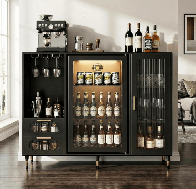 AUN Large Coffee Bar Cabinet with Frige pace, Modern Luxury Coffee Bar with Gold Accents, Wine Glass Rack and Glass Doors, 47.2" wide, Multipurpose Display Storage for Home Color: Black
