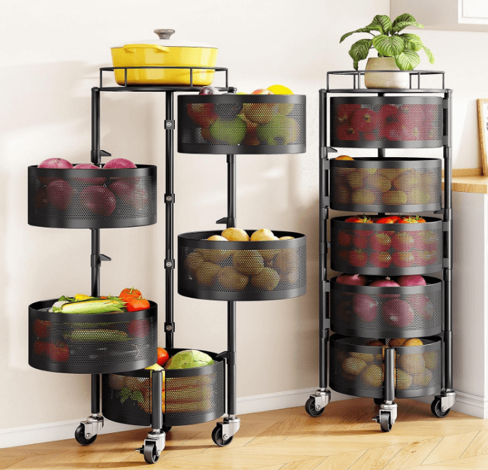 SNTD Fruit and Vegetable Basket Bowls for Kitchen with Metal Top Lid, 5 Tier Rotating Storage Rack Cart for Potato, Onion, Bread, Fruit, etc. Wire basket Organizer on Wheels Color: Black