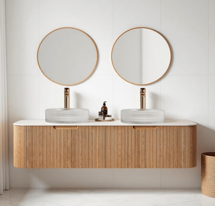 60" Bathroom Vanity Storage with Double Sink, Floating Bathroom Vanities with Round Crystal Glass Basin and Marble Top, 2 Large Soft-Closing Storage Drawers, Pre-Assembled Cabinet, Natural Wood