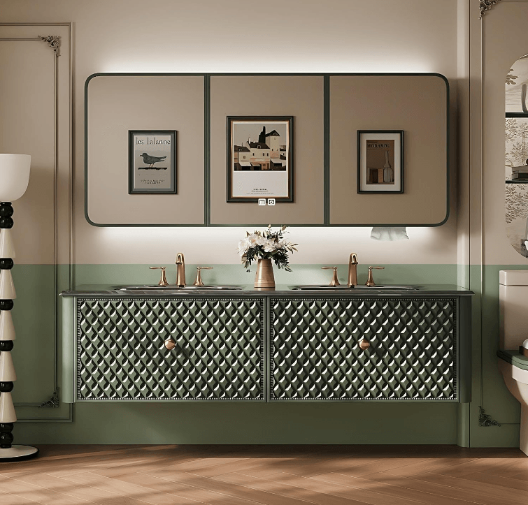 Modern Bathroom Vanity with Sink and Anti Fog Mirror, Solid Wood Double Basin Vanity Cabinet, Seamless Ceramic Countertop, Storage Drawers,Luxury Retro Carved Design Mirror Cabinet Size: 88" Color: Green