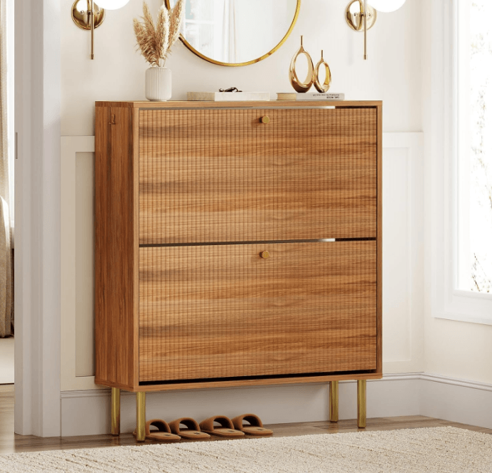 Nicetree Shoe Storage Cabinet, 2 Flip Drawers Shoe Cabinet with Tiered Fluted Design, Slim Shoe Storage Rack with Gold Legs, Color: Midnight Walnut