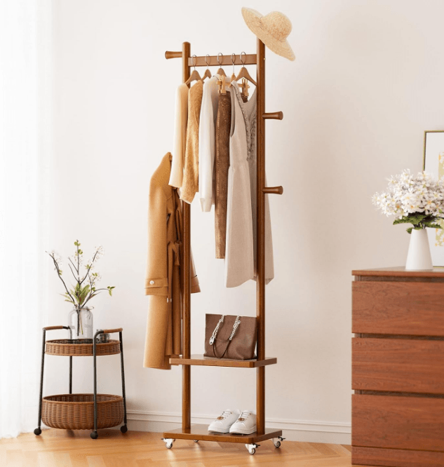 Solid Wood Coat Rack Freestanding Clothing Rack with Wheels and 2 Storage Shelves and 5 Hooks